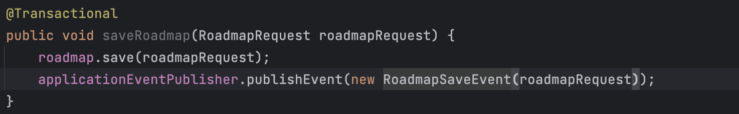 그래서 생각한 방법은 Spring Event를 활용하는 것이었다. 로드맵을 생성하는 본 로직에서 특정 Event를 발행하고, EventListener에서 파일 I/O를 하는 방법이다.
